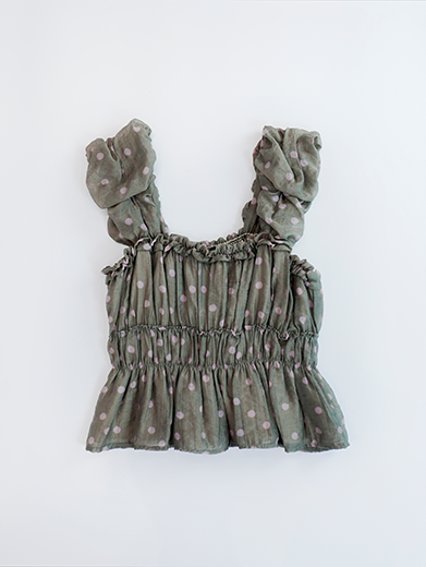 Chiếc áo hai dây màu xanh rêu nhạt, họa tiết chấm bi hồng nhạt, thiết kế dáng ngắn với phần thân chun co giãn cực đáng yêu. Dây áo được may nhún bồng nhẹ, tạo cảm giác nữ tính và trẻ trung.