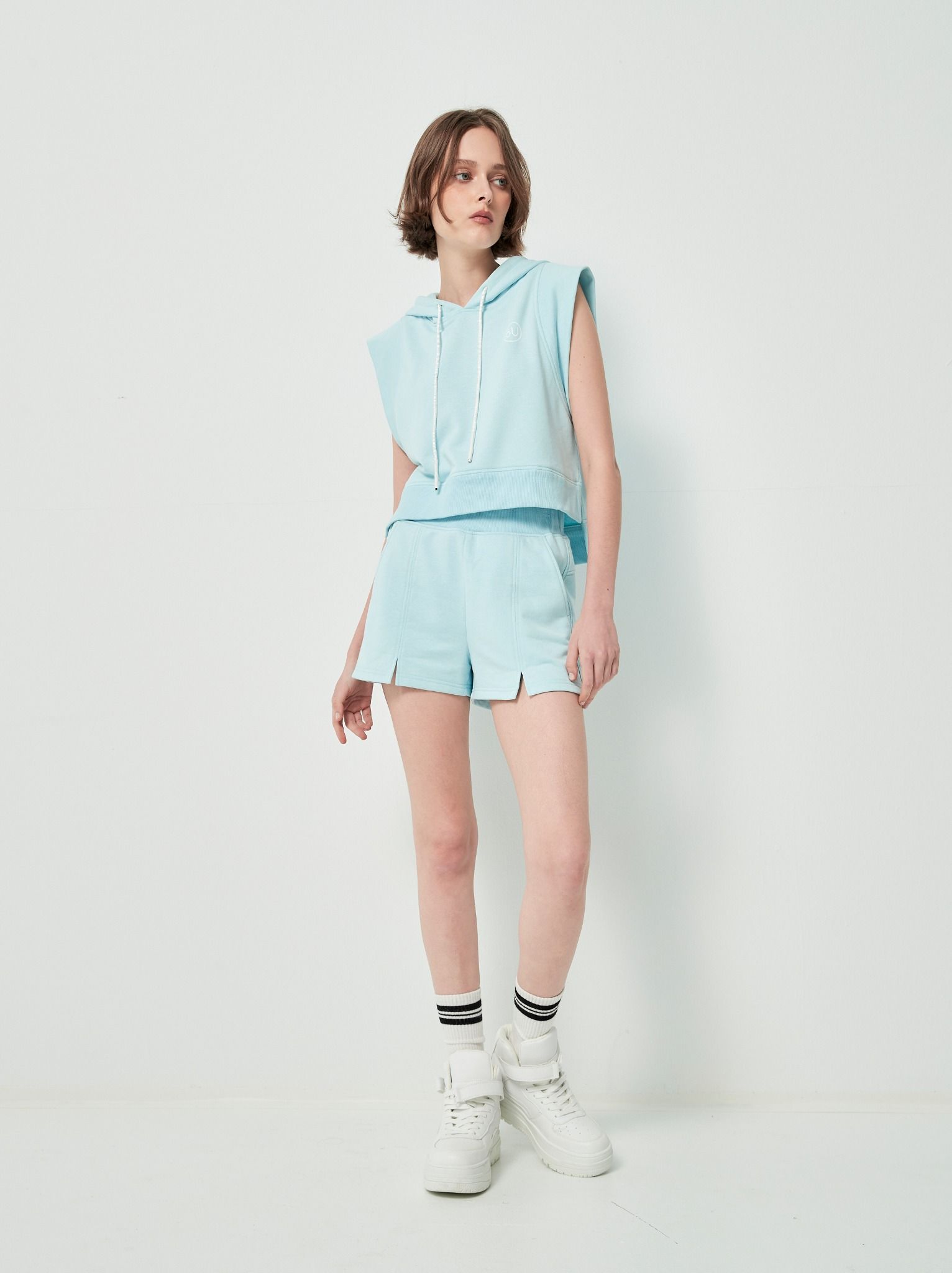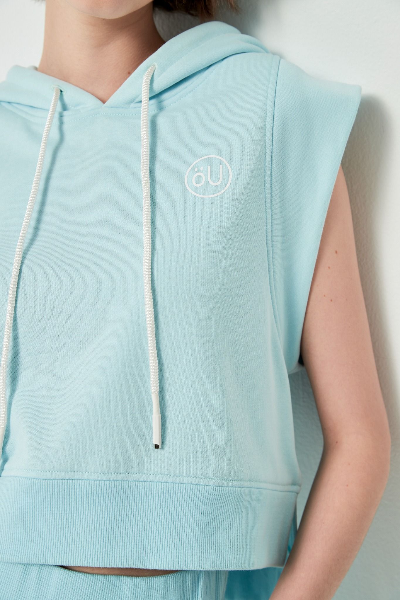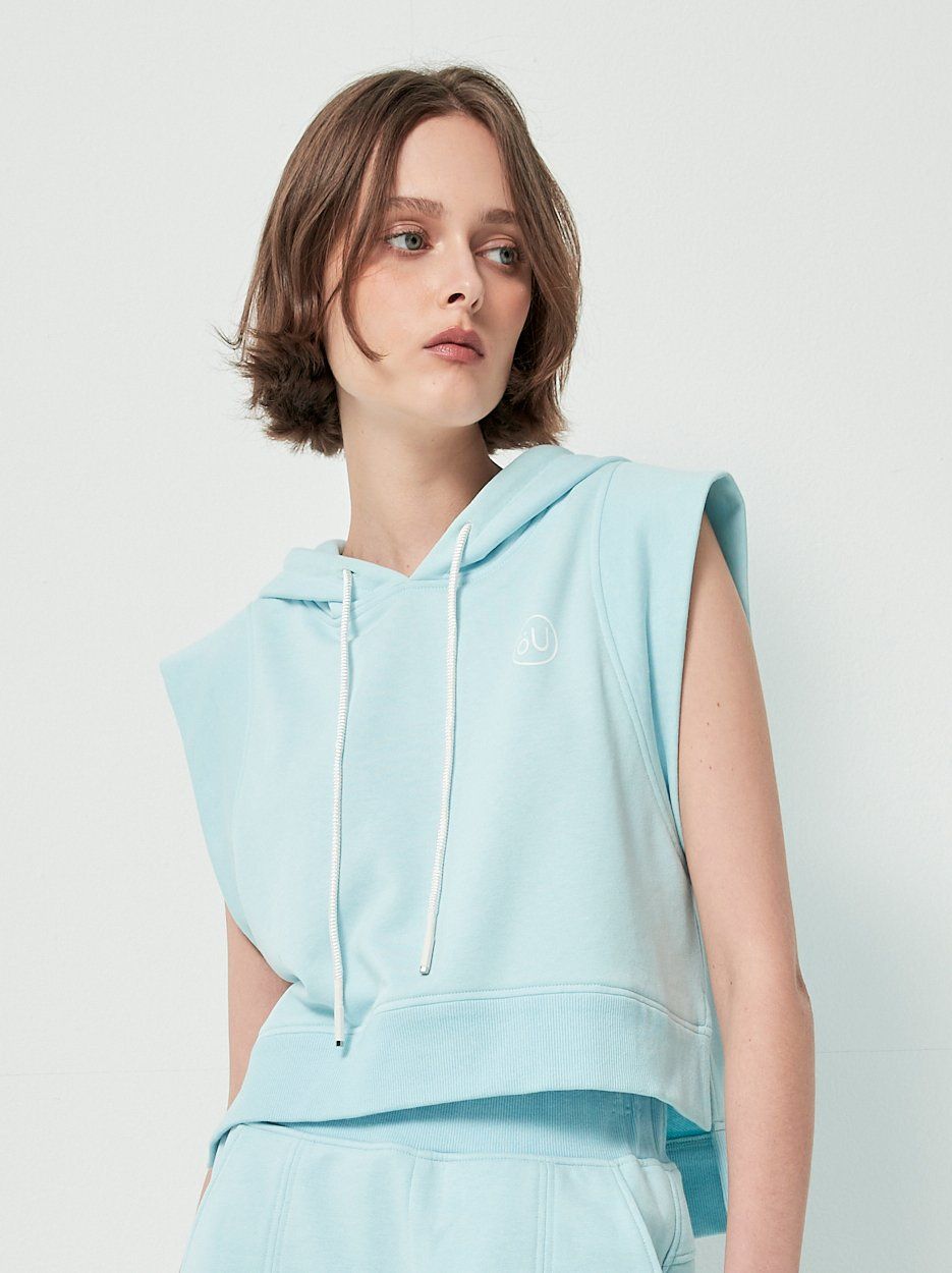 Áo màu xanh có mũ, chất vải dày dặn, tay áo rộng rãi.