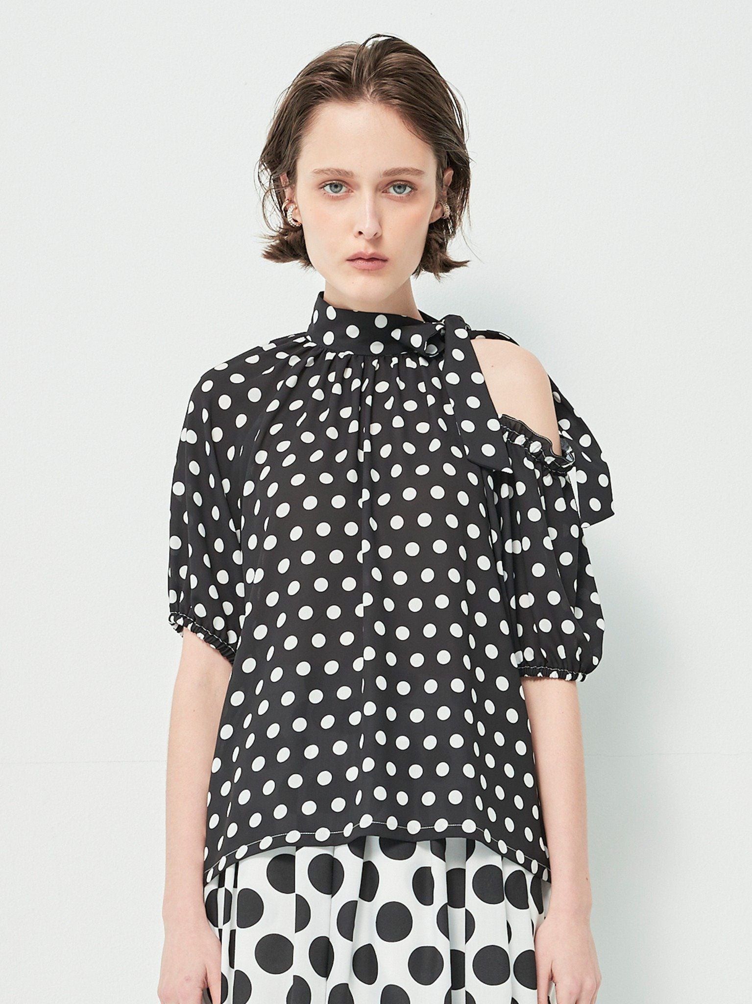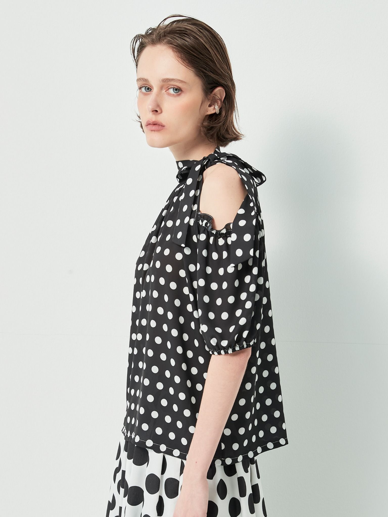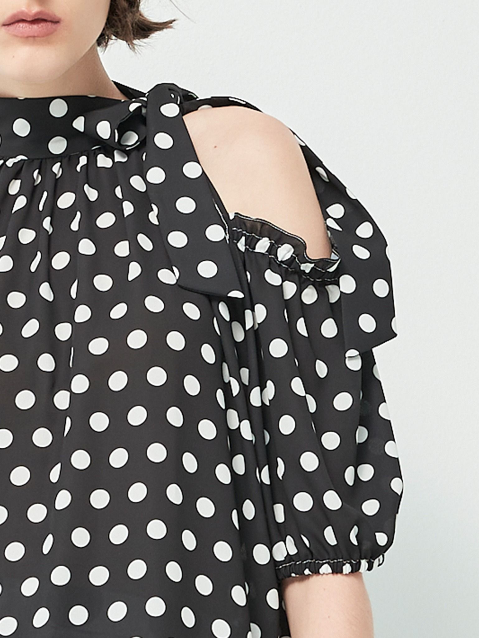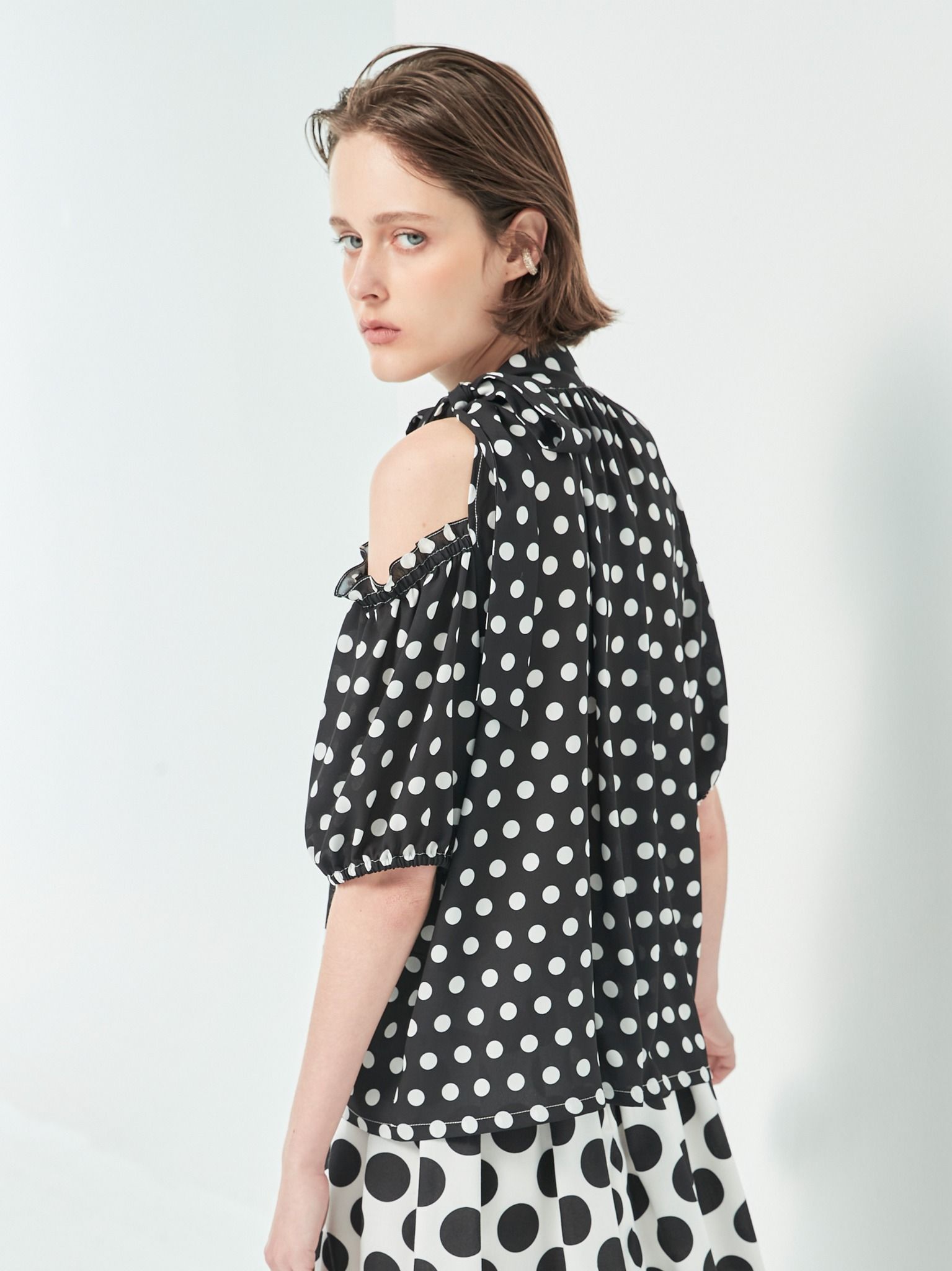 Áo chấm bi trắng được khoét vai, có dây ở cổ để cột nơ, ống tay may nhún bèo.