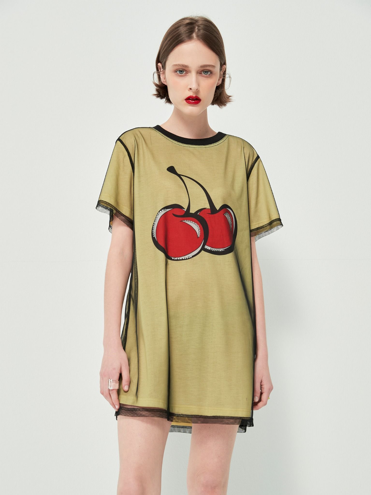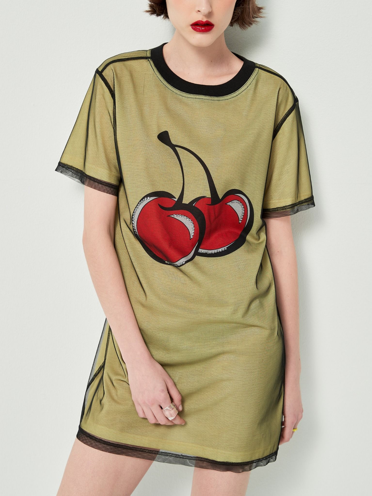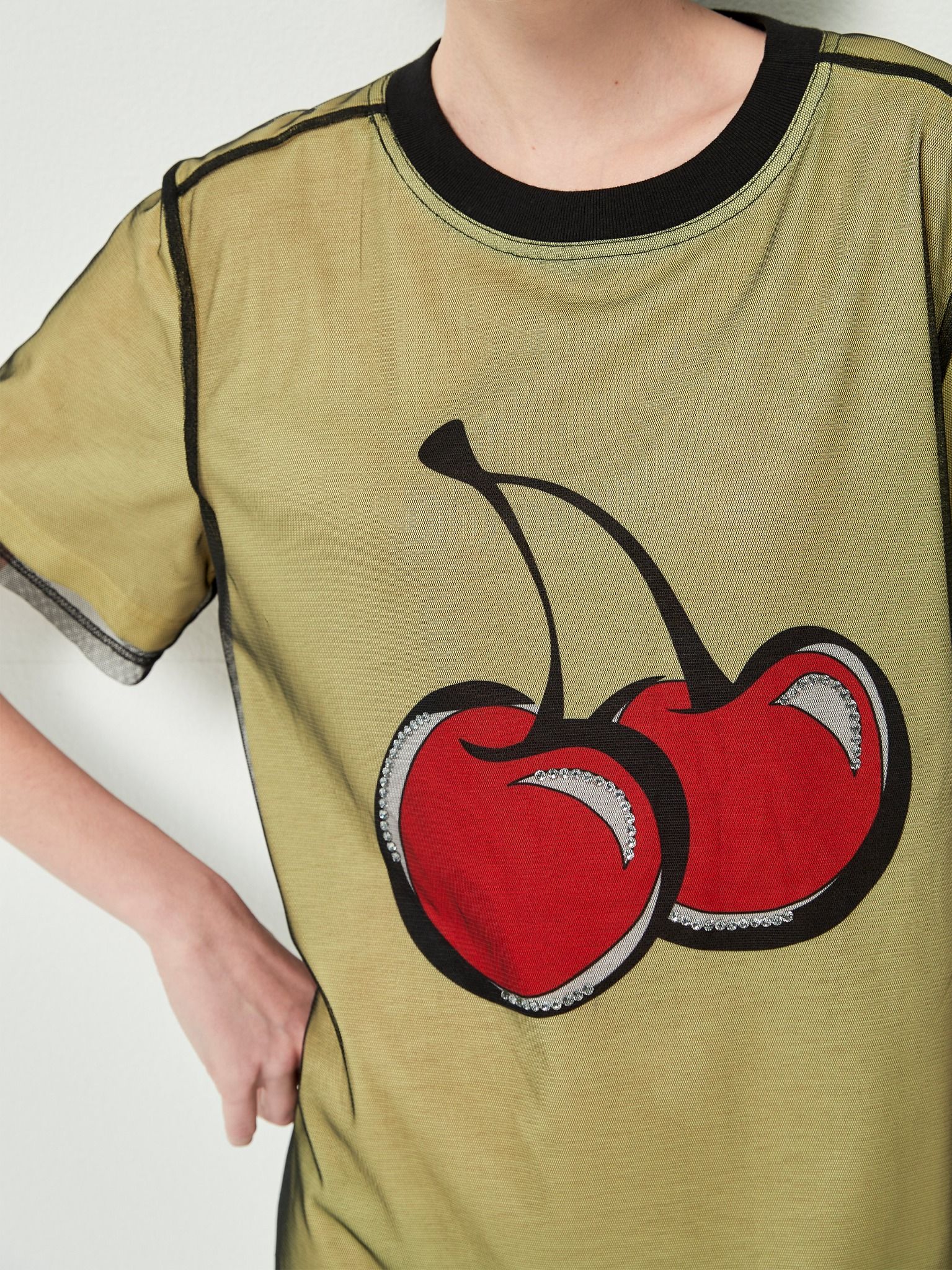 Áo thun vàng in hình quả cherry, có lớp ngoài là một lớp lưới đen mỏng tạo nên hiệu ứng vô cùng mới mẻ cho 1 chiếc áo thun đơn giản