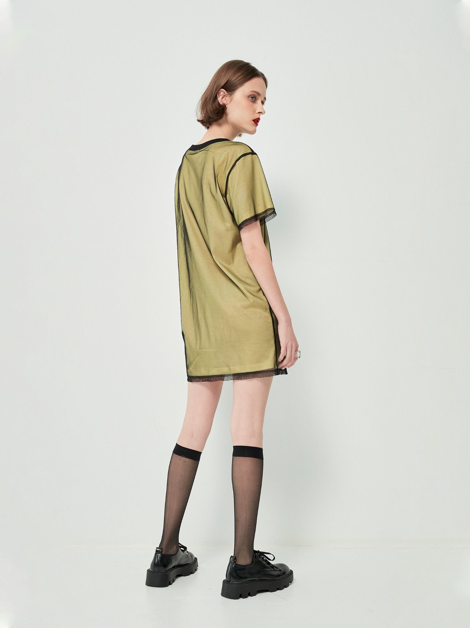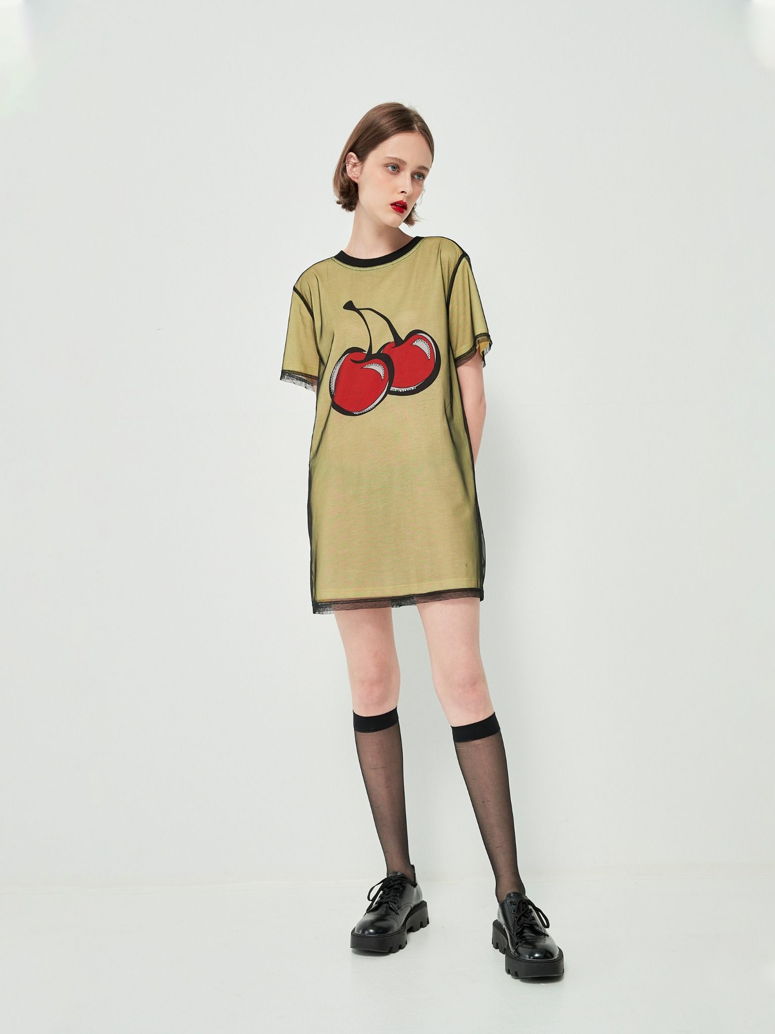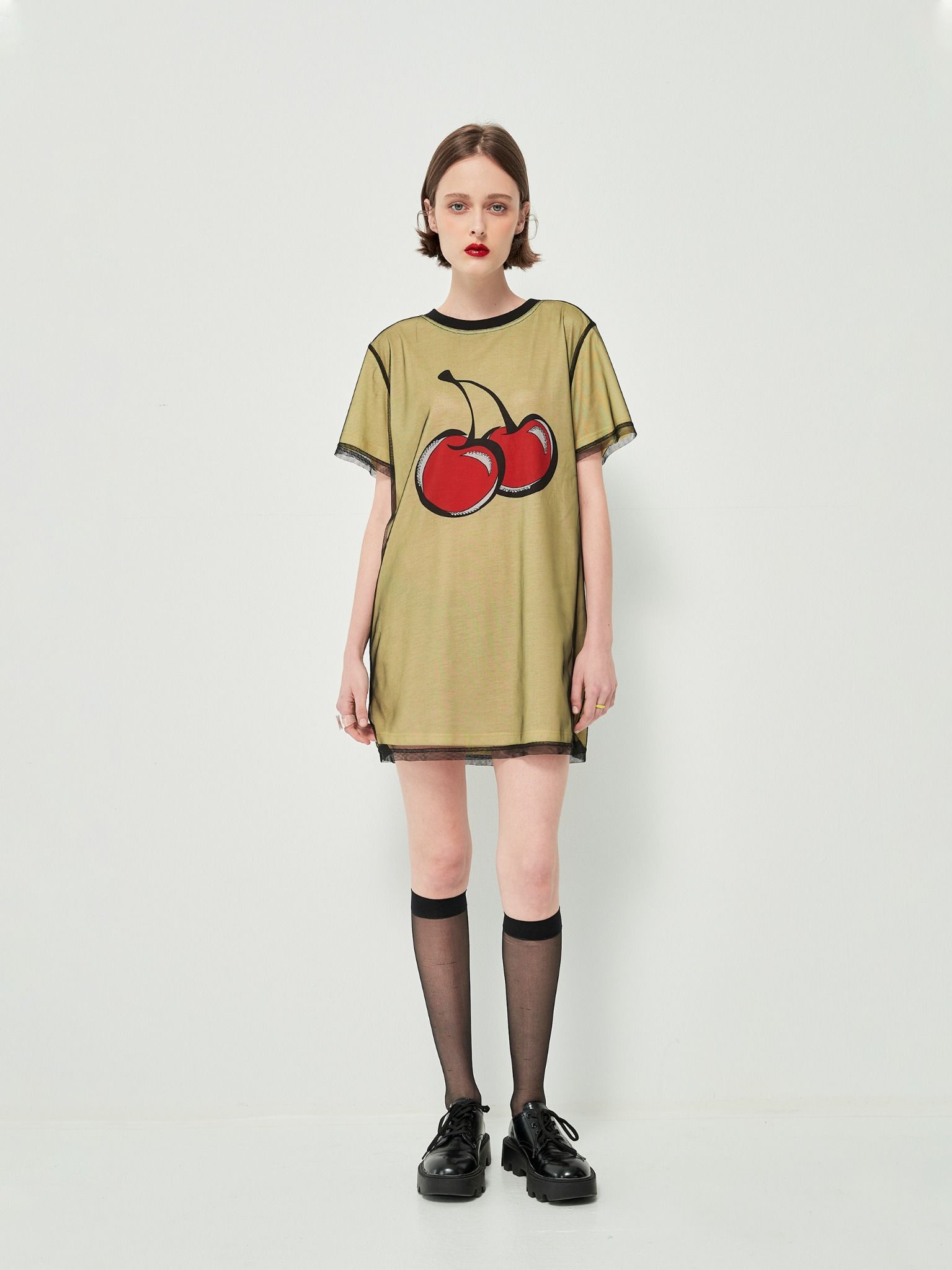 Áo thun vàng in hình quả cherry, có lớp ngoài là một lớp lưới đen mỏng tạo nên hiệu ứng vô cùng mới mẻ cho 1 chiếc áo thun đơn giản