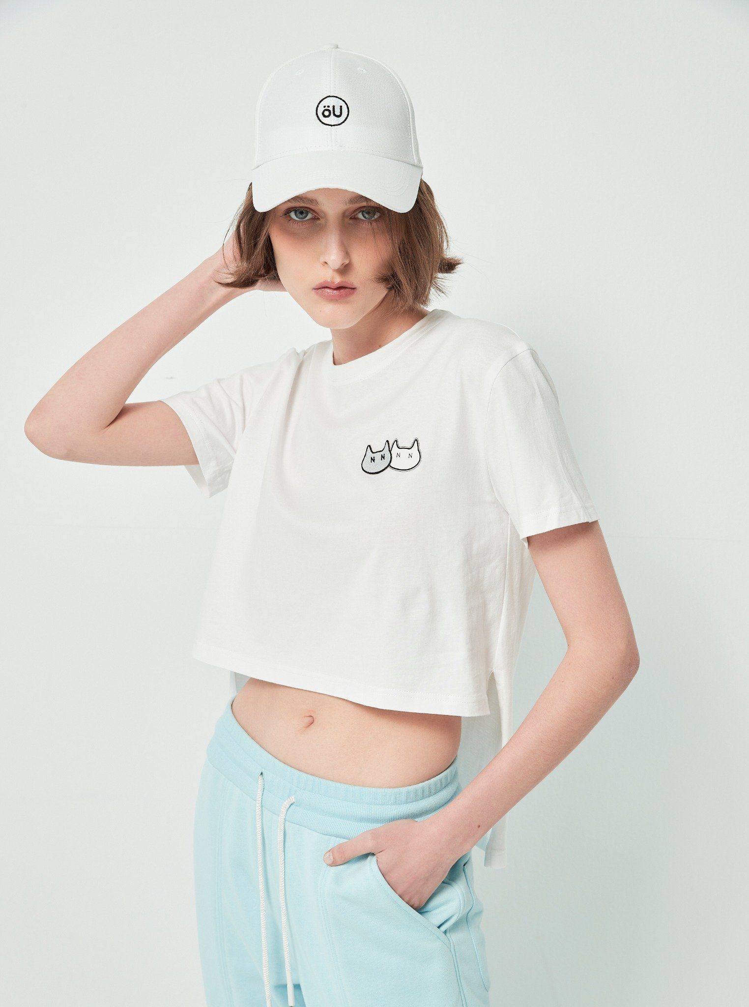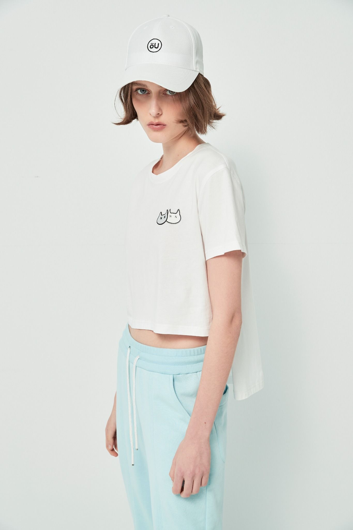 Áo thun crop in họa tiết mèo con, vạt sau dài.