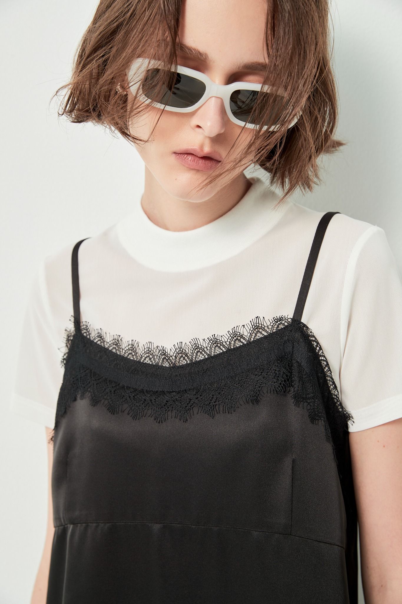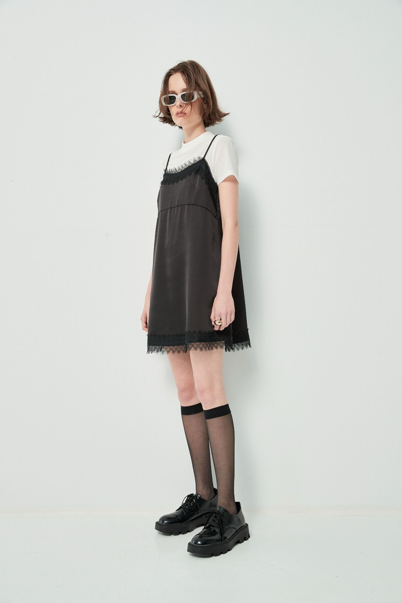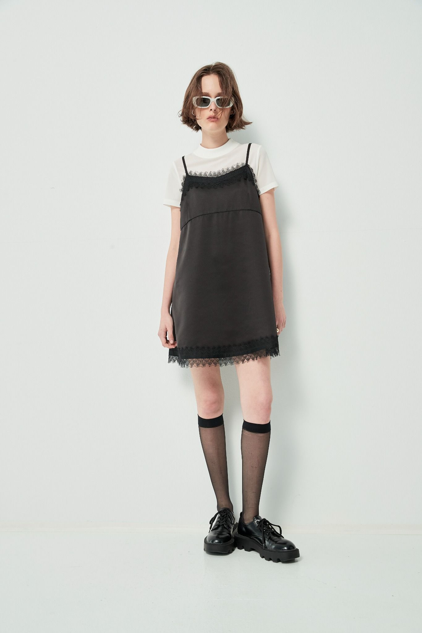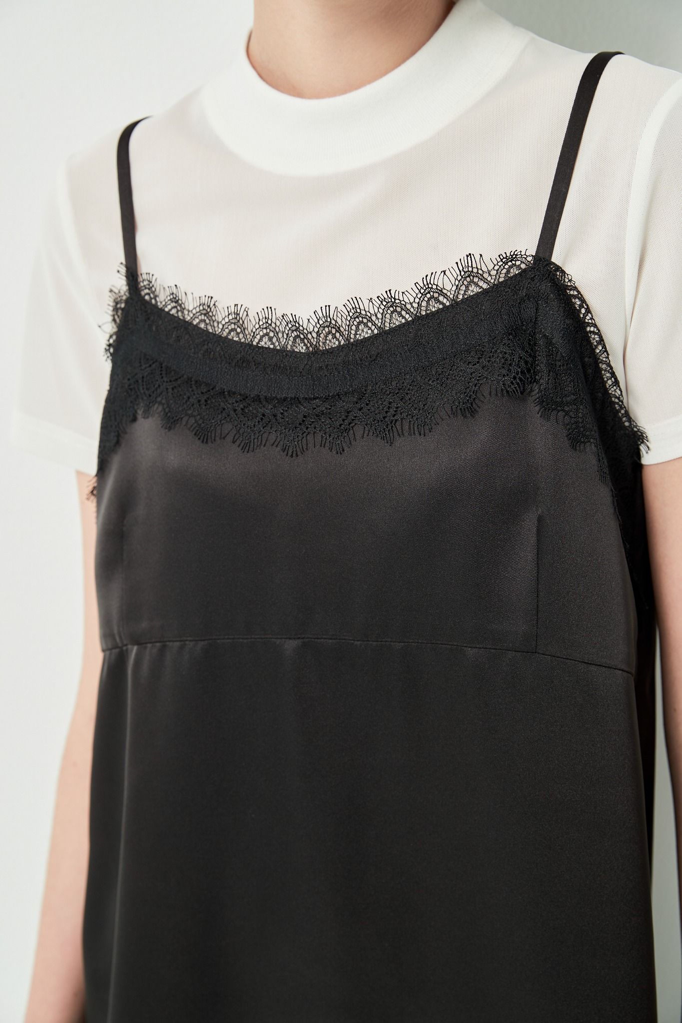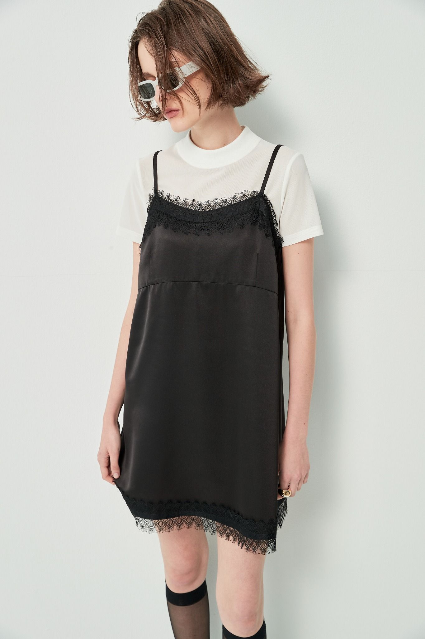 Váy lụa 2 dây viền được may 1 lớp vải ren tạo điểm nhấn.