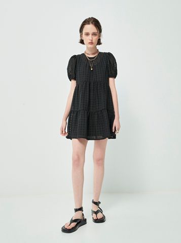 Đầm Babydoll Tay Phồng Họa Tiết Caro Đen