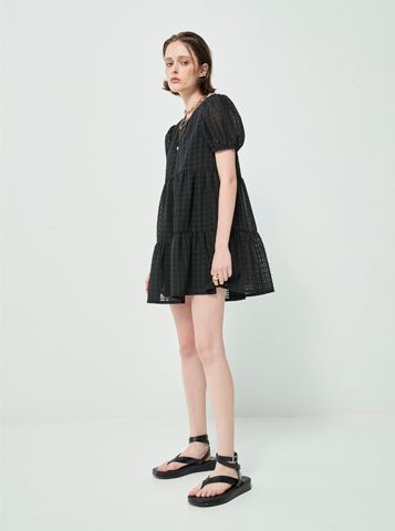 Chiếc đầm babydoll đen mang phong cách trẻ trung và nữ tính với thiết kế tay phồng nhẹ và họa tiết caro chìm tinh tế. Phần thân đầm được may theo kiểu tầng, tạo độ bồng bềnh tự nhiên, giúp che khuyết điểm cơ thể hiệu quả.