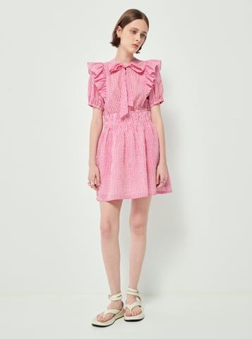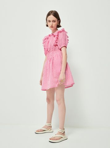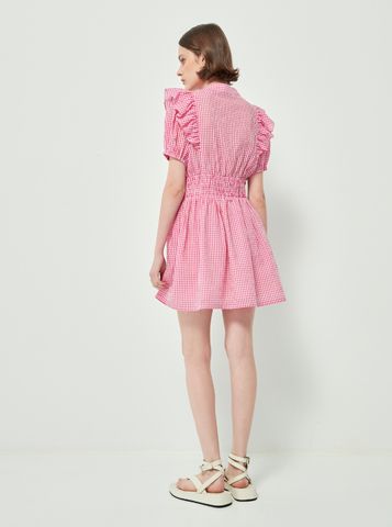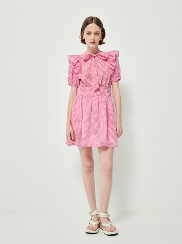Đầm hồng caro có dây thắt nơ ở cổ, nhún bèo ở hai bên vai dáng xòe bồng bềnh, nhẹ nhàng và cá tính cho nữ