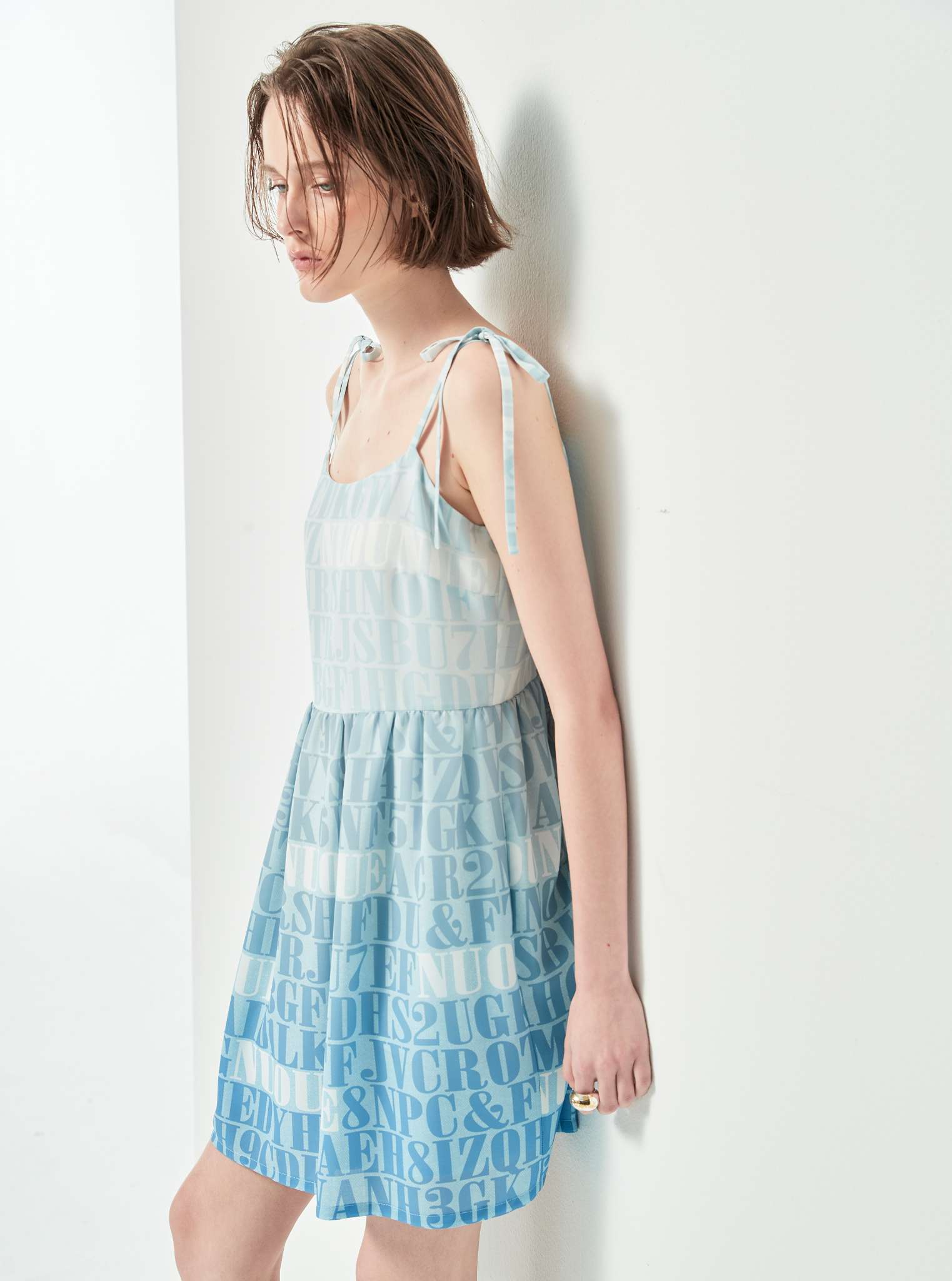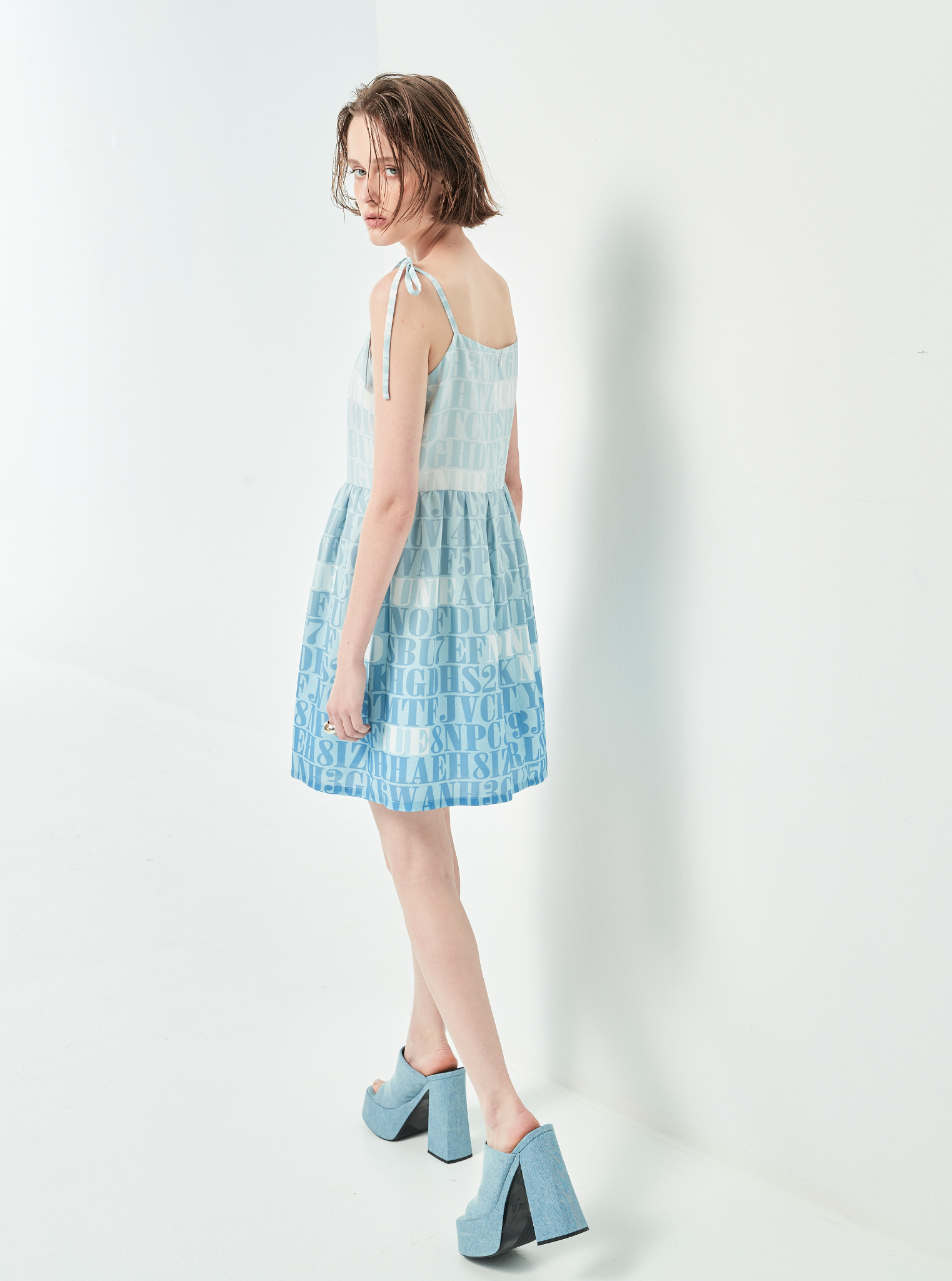 Họa tiết: In chữ kiểu typography all-over với hiệu ứng ombré chuyển sắc từ trắng xuống xanh dương nhạt – độc đáo và thu hút ánh nhìn.