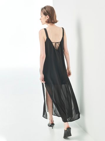 Chiếc váy dài dáng suông được thiết kế theo phong cách tối giản nhưng đầy quyến rũ. Chất liệu lụa mềm mại, nhẹ và mát, tạo cảm giác bay bổng khi di chuyển. Phần lưng hở kết hợp dây đan tinh tế là điểm nhấn nổi bật, tôn lên đường cong và mang lại vẻ đẹp gợi cảm nhưng vẫn thanh lịch.