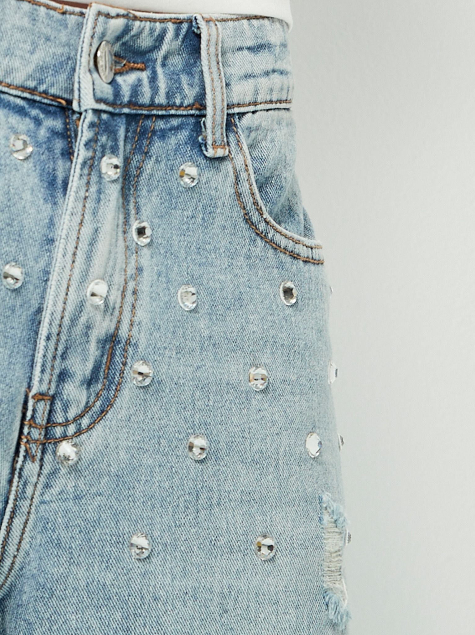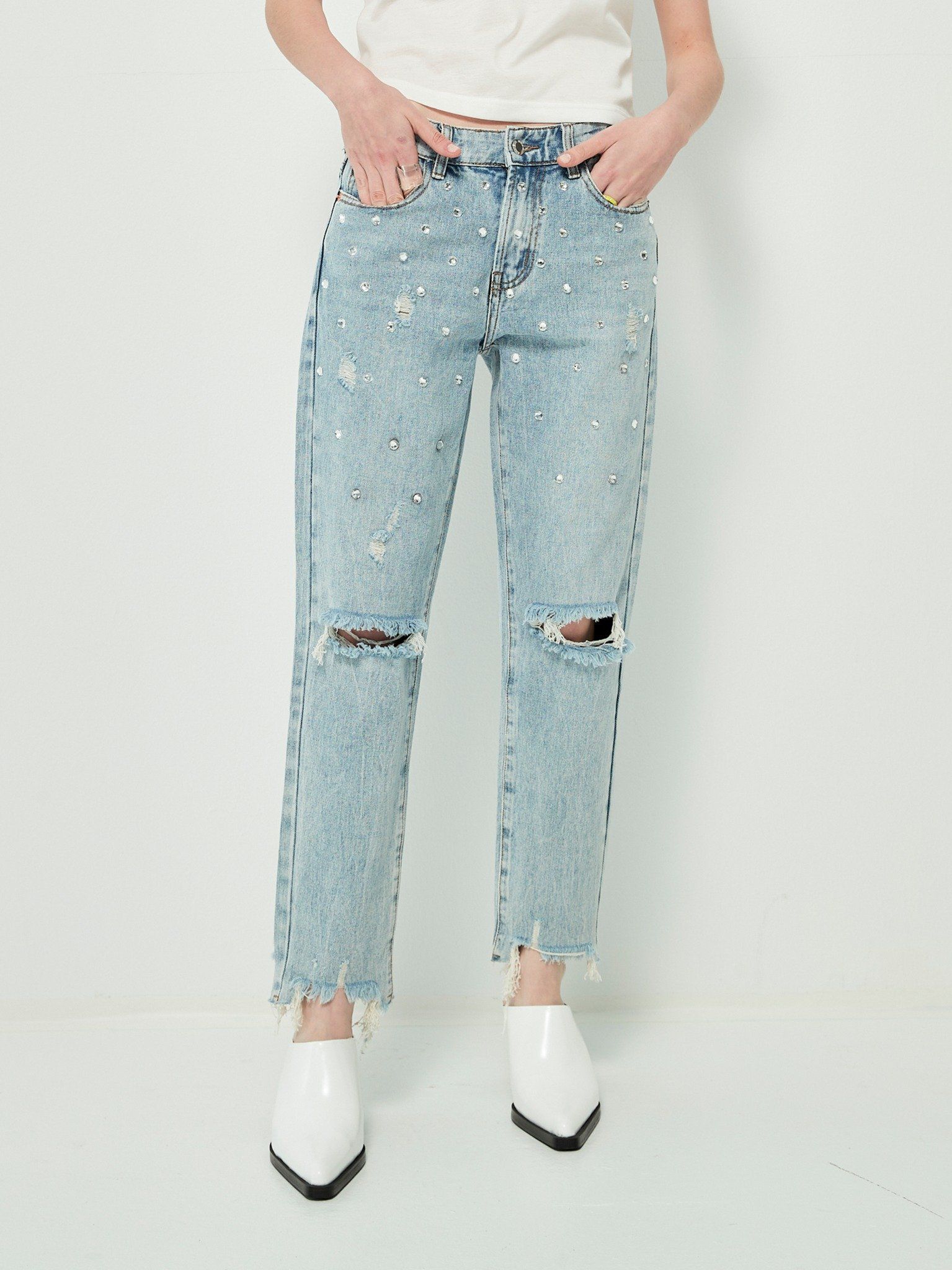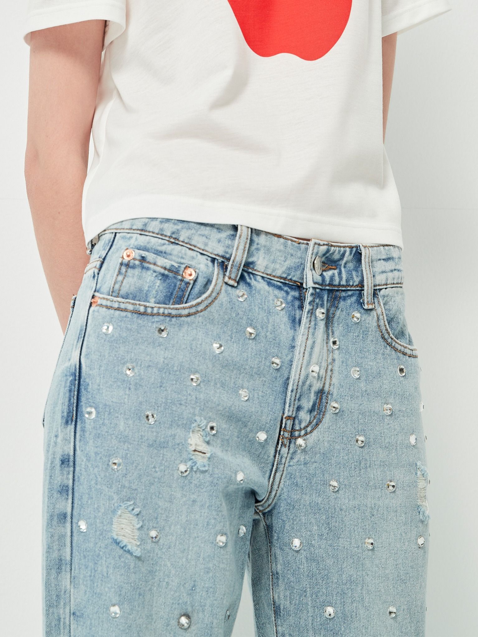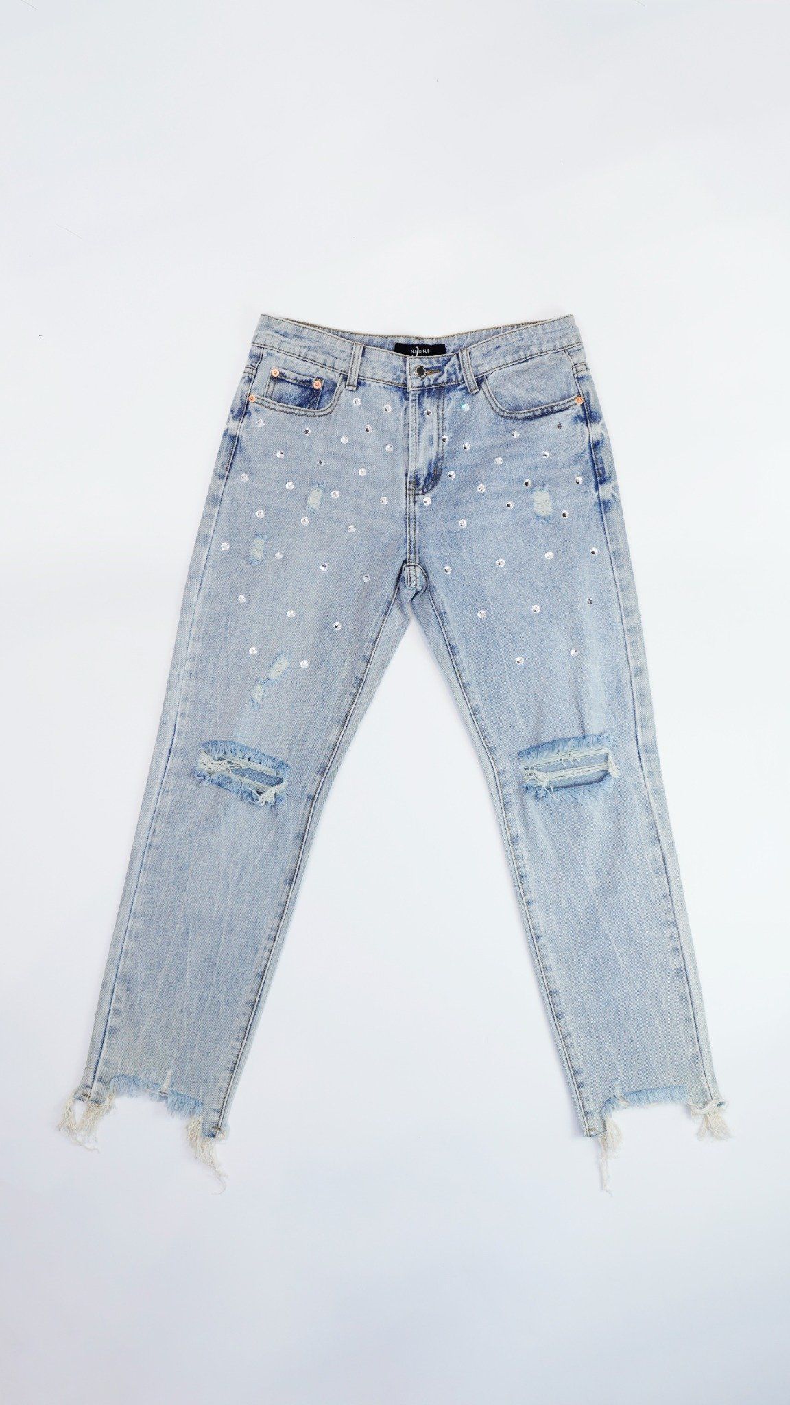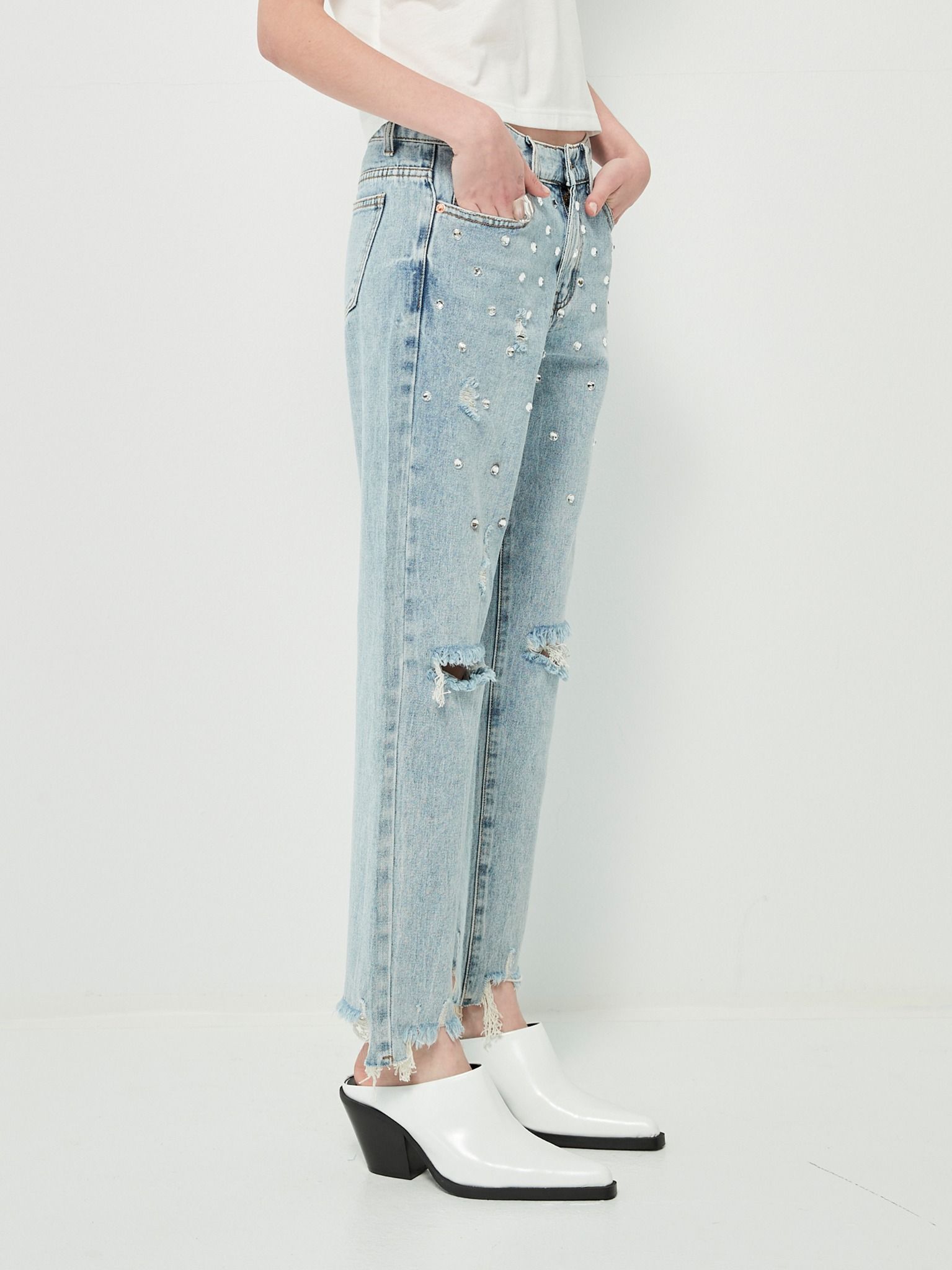 Quần jean dài rách gấu có đính đá ở phần trên mặt trước, ống quần tua rua cá tính.