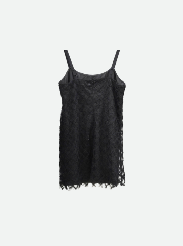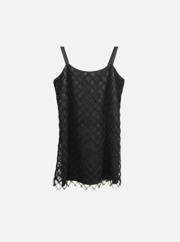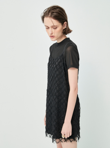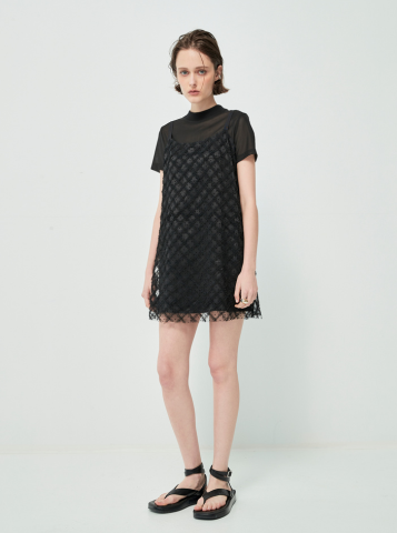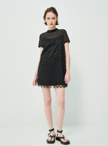Chiếc váy trong hình là hiện thân của sự tinh tế và cá tính hiện đại. Với thiết kế layer ren đen tạo nên một tổng thể thời thượng, vừa phóng khoáng lại vừa thanh lịch. Họa tiết caro dập nổi trên nền ren mang đến cảm giác sang trọng và quyến rũ một cách nhẹ nhàng, chi tiết cổ cao nhẹ và tay ngắn tạo điểm nhấn tinh tế, phù hợp cho những cô nàng yêu thích sự tối giản nhưng vẫn muốn khẳng định cá tính riêng. Độ dài váy vừa phải giúp tôn dáng, khoe khéo đôi chân thon dài, đồng thời tạo cảm giác năng động, trẻ trung. Phối cùng sandals đế bệt, tổng thể trang phục mang đậm phong cách Urban chic – phóng khoáng, hiện đại và đầy thu hút.